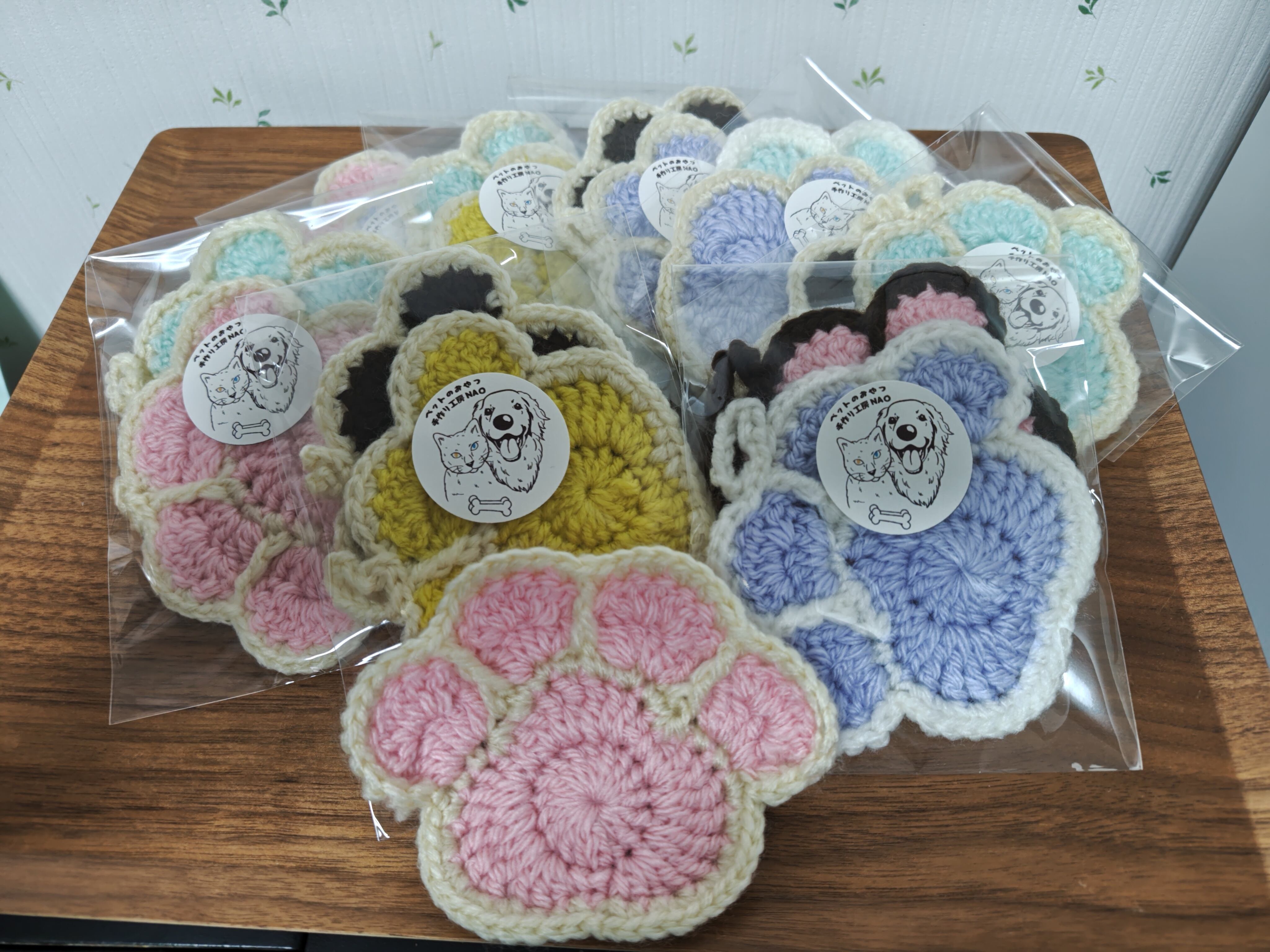一つ一つ手作りのアクリルたわし兼コースター、わんちゃんねこちゃんの食器のぬるつきも取れてコースターにも最適です!